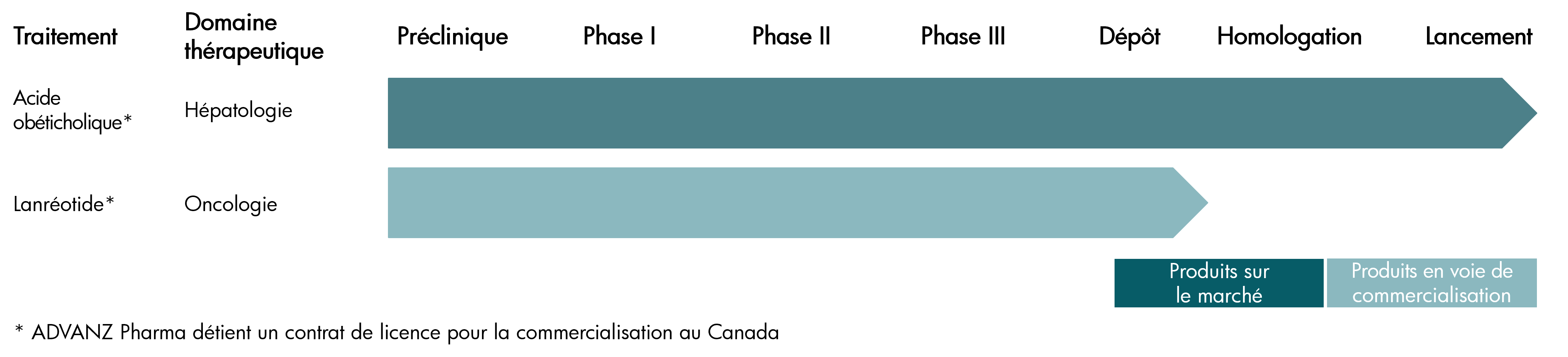 Le portefeuille et le pipeline de produits d’ADVANZ PHARMA Canada sont composés de médicaments spécialisés, de médicaments génériques complexes et de biosimilaires innovants, ainsi que de médicaments de marque. Nos produits et notre pipeline en expansion couvrent une vaste gamme de domaines thérapeutiques, y compris l’hépatologie, la gastroentérologie, l’oncologie et, de façon plus générale, les maladies rares.